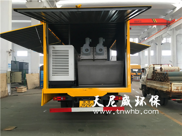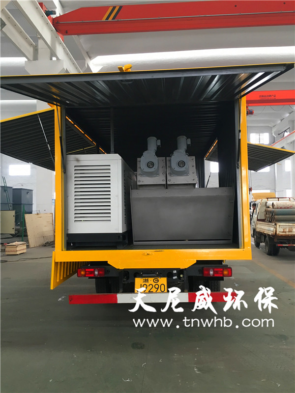 車載式污泥脫水機(另稱:化糞池清理車、移動脫水機),包括車體、污泥壓干機、進料泵和攪拌裝置,所述進料泵安裝在所述車體的一側,在所述進料泵的出口端連接著管道,所述管道的另一端連接著所述攪拌裝置,所述攪拌裝置中設有空氣壓縮系統,所述攪拌裝置的污泥出口處連接著所述污泥壓干機,所述污泥壓干機的出處依次連接著皮帶機和集裝箱,所述攪拌裝置、污泥壓干機和皮帶機安裝在所述車體的中部,所述集裝箱安裝所述車體的后方。